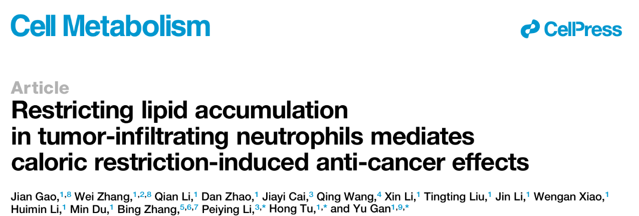 2025年12月5日,上海交通大学医学院附属仁济医院-上海市肿瘤研究所屠红/甘愉团队,联合仁济医院临床研究中心李佩盈团队,在Cell Metabolism发表了题为 “Restricting Lipid Accumulation in Tumor-Infiltrating Neutrophils Mediates Caloric Restriction Induced Anti Cancer Effects”的研究论文。该研究揭示以肿瘤浸润中性粒细胞脂质代谢为核心的热量限制(Caloric Restriction, CR)抗肿瘤新机制,为靶向中性粒细胞开发新型肿瘤治疗策略提供了重要理论依据。